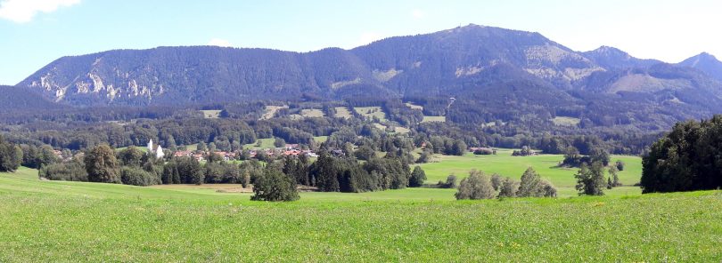In frischem Grün präsentiert sich die Ferien- und Hochtalregion Samerberg nach einem sehnlichst erwarteten Regenschauer inmitten eines glänzenden Hochsommers – davon zeugt diese aktuelle Panoramaaufnahme mit Grainbach und dem dahinter liegendem Bergmassiv.