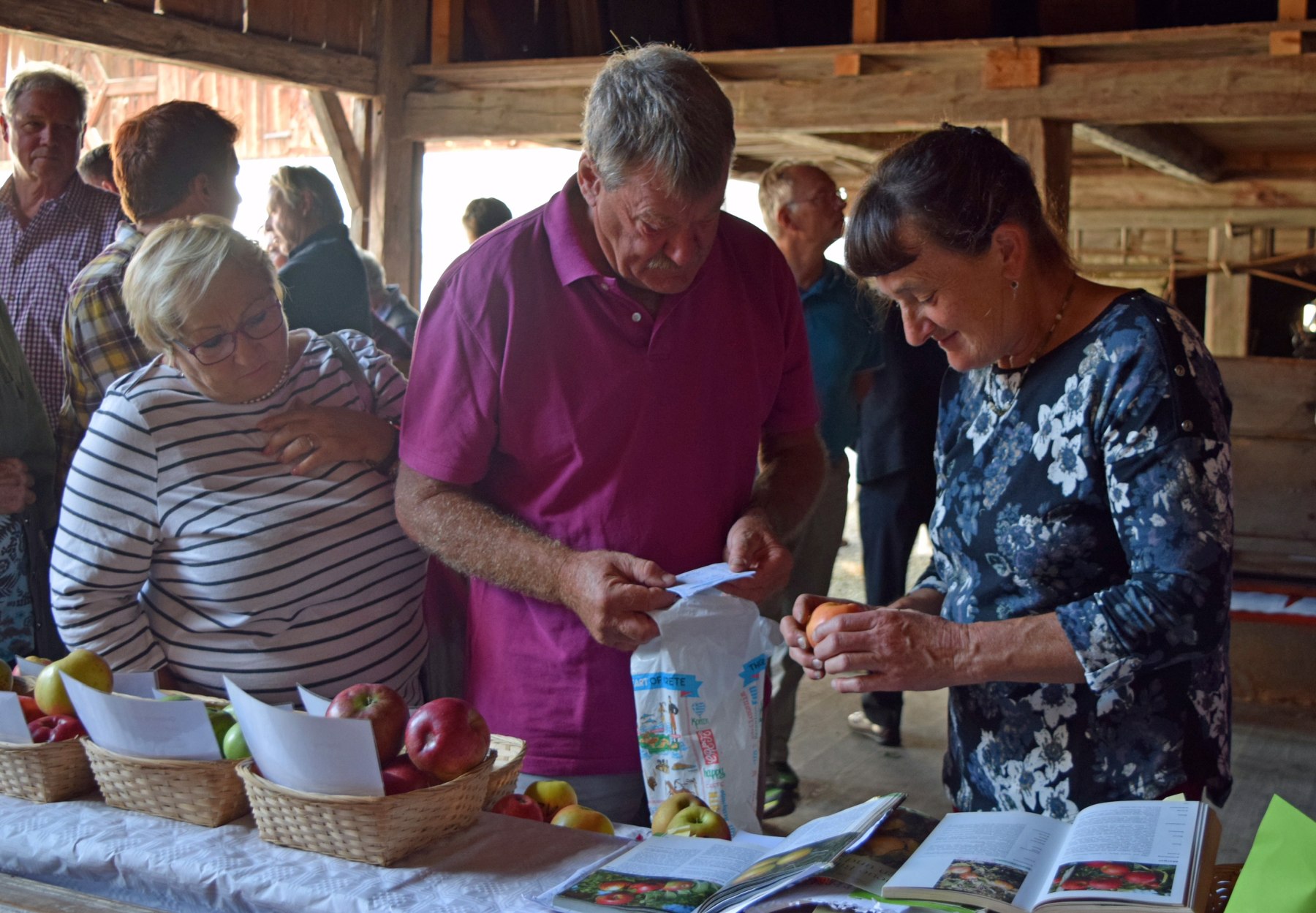 Gefragter Expertenrat: Die Pomologin Maria Seidinger beim Bestimmen von mitgebrachten Äpfeln der Besucher. © Bezirk Oberbayern, Archiv BHM, Aufnahme: Niklas Hertwig.