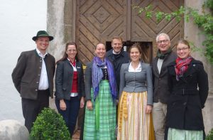 Wie man trotz schlechtem Wetter gute Laune verbreitet, zeigten die Organisatoren des Klösterlichen Marktes und des Tages der Volksmusik (von li. n. re.): Leonhard Meixner (Volksmusikpfleger Bezirk Oberbayern), Johanna Binder (Leitung Kultur Kloster Seeon), Irmengard Wagener (Volksmusikpflege), Pfarrer Dr. Florian Schomers, Antonia Kreppert (Volksmusikpflege), Gerhard Schölzel (Geschäftsführer Kloster Seeon), Katharina Bucher (Volksmusikpflege)