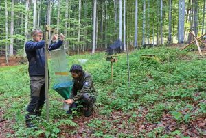 Naturschutz-Mitarbeiter Jens Schlüter (links) und EU-Ranger Nico Daume Installieren auf einer der Forschungsflächen im Nationalpark Bayerischer Wald eine Flugfensterfalle. (Foto: Nationalpark Bayerischer Wald)