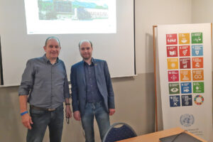 Oliver Pohl (l.), Umweltbeauftragter des Nationalparks Berchtesgaden, präsentierte die ganzheitliche Umweltstrategie der Nationalparkverwaltung mit den Bausteinen EMAS, EMASplus, Agenda 2030 sowie dem regionalen Netzwerk „Partner-Initiative“, die von den Teilnehmenden, darunter auch Oliver Hasenkamp (r.) vom Sekretariat der DGVN, als besonders vorbildlich und zukunftsweisend gelobt wurde.