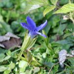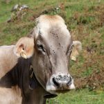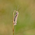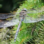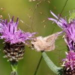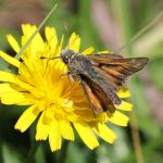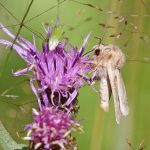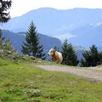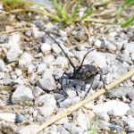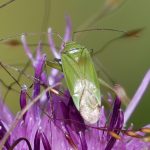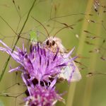 Spitzstein: Bei der Ankunft am Morgen ist der Himmel noch bedeckt, später klart es auf und es wird heiß. Kühe leiden sicher auch unter den vielen Fliegen. Die Aussicht auf das Kaisergebirge ist großartig. Graubindige Mohrenfalter (Erebia aethiops) begleiten uns beim Anstieg. An einer Fichte ruht eine männliche Torf-Mosaikjungfer (Aeshna juncea). Eine Kuh nimmt denselben Weg wie wir. In der Wiese neben dem Weg sitzt ein Gemeines Grashüpfer Männchen (Chorthippus parallelus). Komma-Dickkopffalter (Hesperia comma), eine Kupfereule (Chersotis cuprea) und eine Grüne Futterwanze (Lygocoris pabulinus) saugen Nektar aus den Wiesen-Flockenblumen. Was macht die Biene/Hummel am Abgrund? Ein Zünsler (Agriphila poliellus) hüpft auf die Seite. Über uns ruft der Mäusebussard. Dieses Mal verabschiedet uns der Langhornbock (Monochamus sartor).
