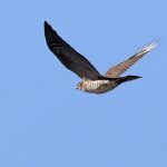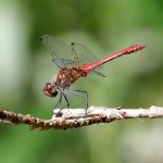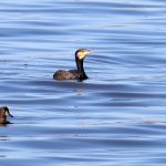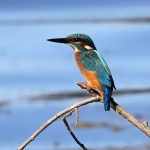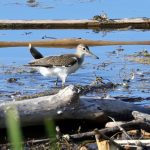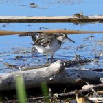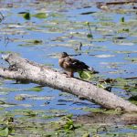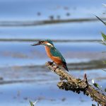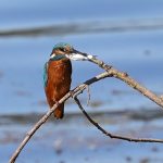 Zu Mittag fahren wir in die Hirschauer Bucht. Nach dem Essen wird aus dem Beobachtungsturm beobachtet und fotografiert. Es gibt viele Mücken, die sich mit unserem Blut vollsaugen, also quasi auch zu Mittag essen. Zu Beginn gibt es ein Stilleben zu sehen: ein entspanntes Stockenten-Weibchen auf einem Baumstamm. Zu unserer Freude kommt der Eisvogel zum Fischen und ist auch erfolgreich. Neben dem Turm ruht ein Blutrotes Heidelibellen-Männchen (Sympetrum sanguineum) auf einem Zweig. Ein Kormoran fliegt ein, jetzt sind auch Teichhühner und Zwergtaucher zu sehen. Ein Fitis hüpft in den Zweigen einer Weide. Der Sperber kommt mehrmals vorbeigeflogen. Ein Flussuferläufer sucht eifrig nach Nahrung in oder zwischen dem angeschwemmten Treibgut. Zum Abschied setzt sich ein Eisvogel-Weibchen auf einen der für sie vorgesehenen Äste.