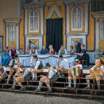 Zwischen Wirtshausrausch und Lebensbilanz: Während sich „Jedermann“ (Bernd Eutermoser) im Zentrum der Szene mit dem Gesellen auseinandersetzt, füllen Bläser in Lederhosen und Darsteller an reich gedeckten Tischen den Marktplatz mit bayerischem Leben. Diese Szene zeigt eindrucksvoll, wie Musik, Mundart und Schauspiel beim „Bayerischen Jedermann“ zu einem mitreißenden Gesamtkunstwerk verschmelzen.