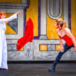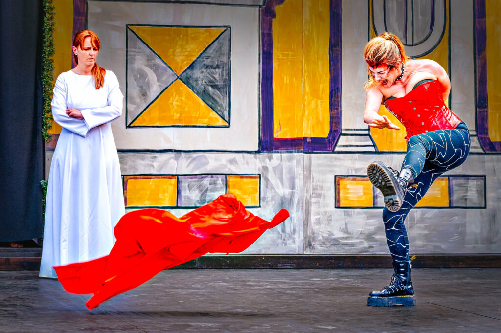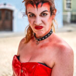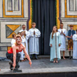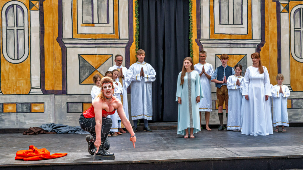 Wut in Lackstiefeln: Der Teufel (Johanna Krinninger) tritt das rote Gewand mit Verachtung davon – der Glaube (Miriam Thoma) bleibt ungerührt. Ein Moment purer Konfrontation. Zwischen Verdammnis und Erlösung – Der Teufel tobt über den Marktplatz. Wenn der Teufel auftritt, bleibt kein Zweifel: Der „Bayerische Jedermann“ in Neubeuern ist kein braves Freilichttheater, sondern ein packendes Spektakel. In knallrotem Korsett, mit Stiefeln wie aus der Unterwelt und wilder Mimik fegt Johanna Krinninger als personifizierte Versuchung über die Bühne – ein wütender, zynischer Gegenpol zum klaren Licht der göttlichen Ordnung. In einer eindrucksvollen Szene stellt sie sich der Gestalt des Glaubens entgegen – weiß gewandet, ruhig, unbeirrbar. Das kraftvolle Wechselspiel zwischen den beiden Darstellerinnen gehört zu den intensivsten Momenten der gesamten Aufführung. Hier geht es nicht nur um das Seelenheil des Jedermann, sondern um den uralten Kampf zwischen Gut und Böse, Versuchung und Vergebung, Hochmut und Demut. Hinter den Darstellern: Ministranten, Engel, Kinder – eine ganze Gemeinschaft, die mitspielt, mitfühlt, mitträgt. Diese Mischung aus tiefem Ernst und barocker Übertreibung ist es, die dem Mysterienspiel seinen unverwechselbaren Charakter verleiht. Man spürt: Die Geschichte ist alt – aber das, worum es geht, ist aktueller denn je.