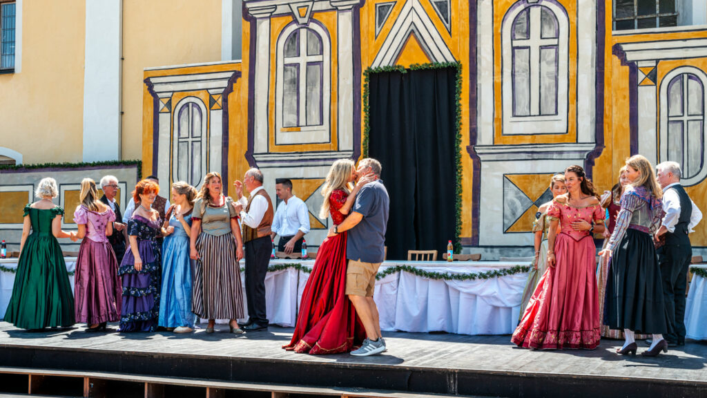 Große Gefühle auf offener Bühne: In einer emotionalen Schlüsselszene umarmt die Buhlschaft (Susanne Schörghuber) ihren Jedermann (Bernd Eutermoser) mit leidenschaftlicher Geste – mitten auf dem Neubeurer Marktplatz. Während um sie herum das bunte Treiben der Gesellschaft tobt, verdichtet sich zwischen den beiden die ganze Tragik und Schönheit des Lebens. Ein Moment, der erahnen lässt, wie intensiv der „Bayerische Jedermann“ 2025 das Publikum berühren wird.