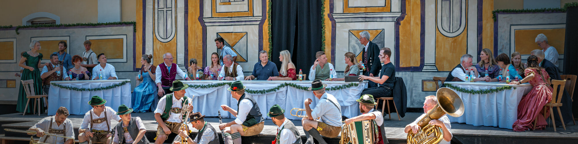 Zwischen Wirtshausrausch und Lebensbilanz: Während sich „Jedermann“ (Bernd Eutermoser) im Zentrum der Szene mit dem Gesellen auseinandersetzt, füllen Bläser in Lederhosen und Darsteller an reich gedeckten Tischen den Marktplatz mit bayerischem Leben. Diese Szene zeigt eindrucksvoll, wie Musik, Mundart und Schauspiel beim „Bayerischen Jedermann“ zu einem mitreißenden Gesamtkunstwerk verschmelzen.