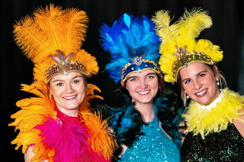 „Rio“ im Porträt: farbenfrohe Federkopfschmuck-Highlights und strahlende Gesichter – Samba-Flair in der Beurer Halle.