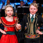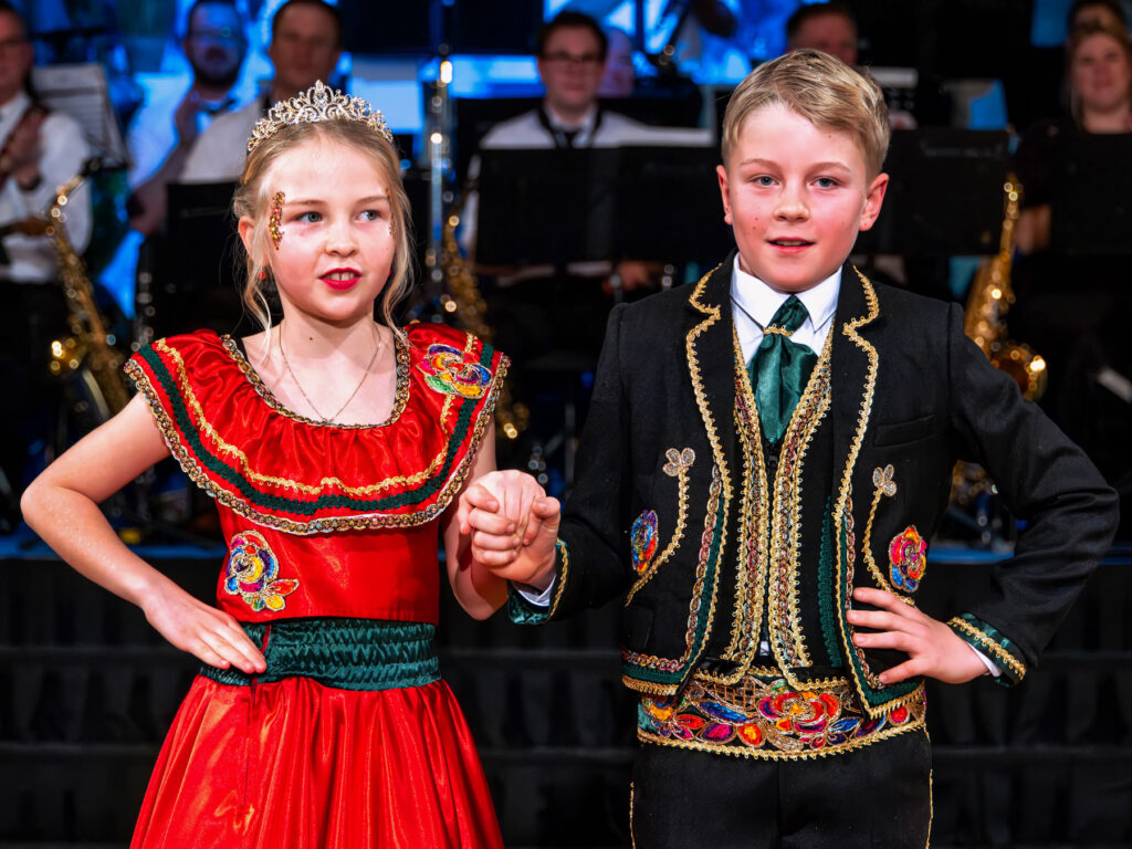 Nah dran am Glanz: das Kinderprinzenpaar bei der Präsentation auf der Bühne – festlich, konzentriert und sichtlich stolz.