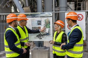 Von links: Daniel Artmann (MdL), Otto Lederer (Landrat Landkreis Rosenheim), Daniela Ludwig (Parlamentarische Staatssekretärin beim Bundesminister des Innern) informieren sich bei Dr. Markus Stecher (Rohrdorfer Net Zero Emission Labs) über die Funktionsweise der neuen Anlage