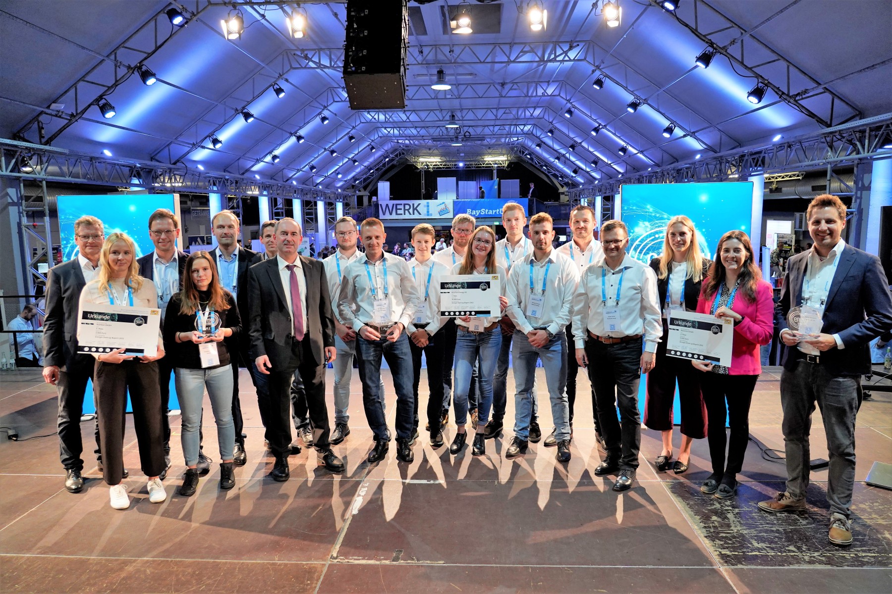 Bayerns Wirtschaftsminister Hubert Aiwanger mit den Vertretern aller drei Preisträger. Quelle: StMWI