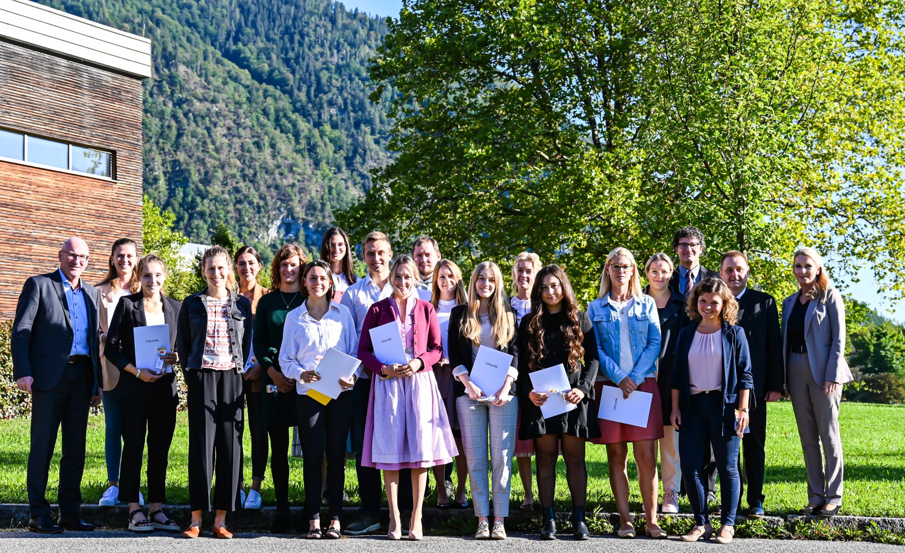 Die 17 neuen Lehrkräfte im Berchtesgadener Land gemeinsam mit Landrat Bernhard Kern (ganz links), Personalratsvorsitzendem Bernd Rüger (2. Reihe, 3. v. r.), Schulamtsleiter Helmut Mayer (2. Reihe, 2. v. r.) sowie stellvertretende Schulamtsleiterin Susanne Ehrichs (ganz links) nach der Vereidigung. Foto: LRA BGL