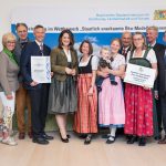 Bericht und Foto: Öko-Modellregion von links: 1. Bgm. Georg Huber, Samerberg, Stv. Landrätin Andrea Rosner, Lkr. Rosenheim, 1. Bgm. Peter Solnar, Aschau i.Chiemgau, 1. Bgm. Anton Wallner, Bad Feilnbach, Staatsministerin Michaela Kaniber, Susanne Mühlbacher-Kreuzer, Projektentwicklerin, Projektentwicklerin Christiane Voggenauer mit Tochter Marie-Elisabeth, 1. Bgm. Christian Praxl, Rohrdorf, 1. Bgm. Marianne Steindlmüller, Frasdorf, 1. Bgm. Felix Schwaller, Bad Aibling, Peter Selz, Leiter ALE Oberbayern, Landtagsabgeordneter Otto Lederer
