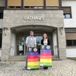 Übergabe UV-Indextafel Gemeinde Rohrdorf (v.l.n.r. Bürgermeister Simon Hausstetter, Katrin Posch Geschäftsstellenleitung Gesundheitsregionplus Landkreis Rosenheim).