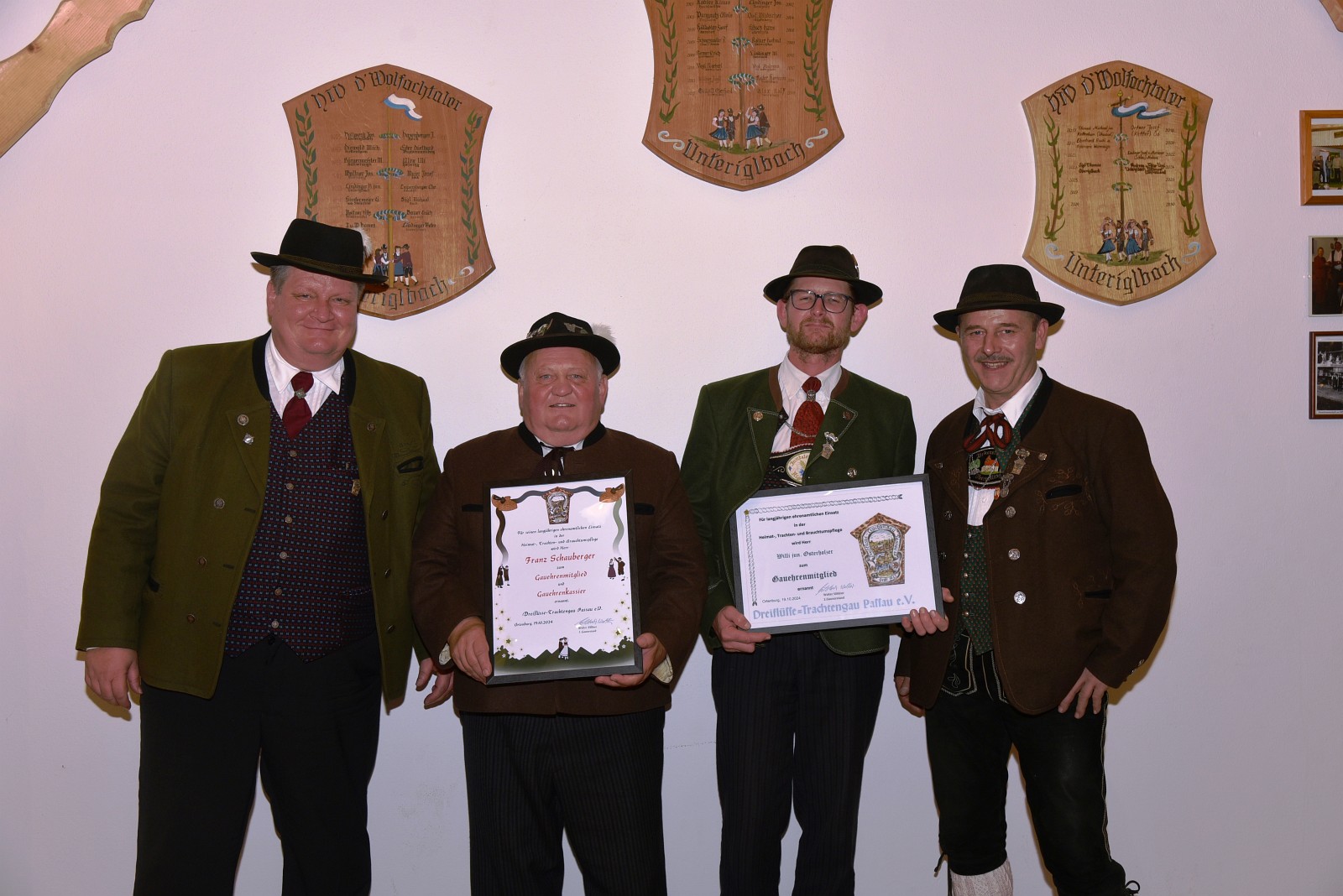 Gauvorstand Walter Söldner (r.) und 3. Gauvorstand Andreas Ginglseder (l.) durften das Engagement für der Brauchtumspflege von Franz Schauberger (2. v. l.) mit der Ernennung zum Gauehrenkassier und von Willi Osterholzer jun. (2. v. r.) zum Gauehrenmitglied würdigen. (Foto: Hauzeneder)