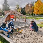 Foto/s: Hötzelsperger – Am Atzinger Spielplatz freuen sich mit Bürgermeister Andreas Friedrich und Bauhofleiter Richard Zettl (dahinter) vor allem die Kleinsten wie Luggi und Liv mit Papa bzw. Mama
