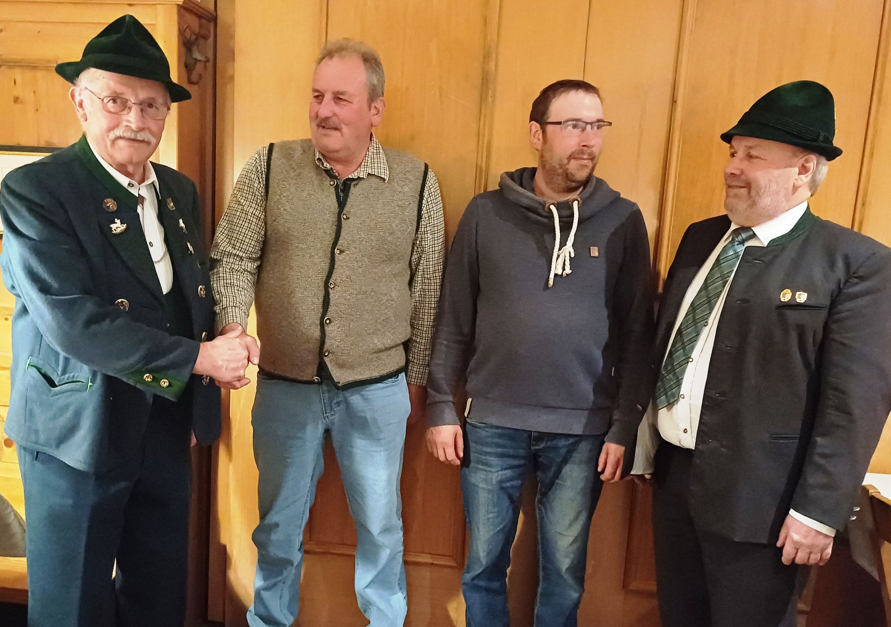 Der scheidende erste Vorstand der KSK Übersee (von links) Sepp Stecher gratulierte seinem Nachfolger, Wolfgang Lindlacher, daneben der neue Beisitzer Albert Schupfner und Gauvorstand Toni Linner.
