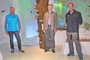 Forstbetriebsleiter Dr. Daniel Müller (Mitte) überzeugte sich bei einem Besuch im Haus der Berge vom Mehrwert des neuen Ausstellungsstücks für die Darstellung von Artenvielfalt, Kreisläufen und dem Wert von Totholz in Waldökosystemen. Nationalparkleiter Dr. Roland Baier (l.) und Stellvertreter Ulrich Brendel (r.) bedankten sich für die stets gute Zusammenarbeit mit den Bayerischen Staatsforsten. Das neue Exponat im Lebensraum Wald ist Teil der noch bis 2024 laufenden Maßnahmen zur weiteren Erneuerung der Ausstellung „Vertikale Wildnis“ im Berchtesgadener Nationalparkzentrum.