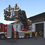 Bildunterschrift: Kommandant Tobias Brinkmann und Zugführer Florian Höhensteiger im Korb der neuen Drehleiter DLK 23/12 der Feuerwehr Aschau. Sie sind künftig verantwortlich für den Einsatz der Aschauer Drehleiter DLK 23/12: die beiden Kommandanten Tobias Brinkmann (zweiter von rechts) und Fabian Schneikart (dritter von rechts), sowie die beiden Zugführer Simon Frank (links) und Florian Höhensteiger (rechts).