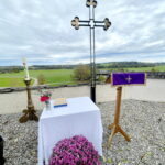 Gemeindereferent Tobias Gaiser erbat Gottes Segen für das Kreuz und betonte, dass das Kreuz ein Zeichen für das Leben ist, auch wenn unsere Lebenswege immer wieder durchkreuzt werden. So blickdurchlässig wie das neue Kreuz in Thalkirchen ist, so durchlässig soll unser Leben für die Botschaft des Kreuzes sein. Mit dem neuen Kreuz wurde auch ein Platz geschaffen, an dem auf dem Friedhof Gottesdienste und Andachten gefeiert werden können und der zum Verweilen einlädt. Es steht an der Friedhofsmauer bietet dem Betrachter einen Blick in der Weite unterhalb von Thalkirchen und ist ebenso ein Blickfang, für alle die in der Ebene unterwegs sind und zur Kirche aufschauen.