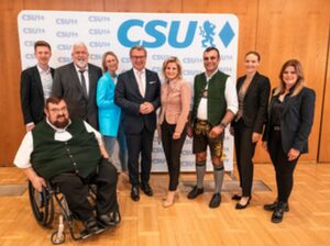 Gruppenbild: von links nach rechts: sitzend (Rollstuhl): Kassier Hans Loy. Hintere Reihe: Bezirksrat und JU-Kreisvorsitzender Matthias Eggerl (stellv. Kreisvorsitzender), Sebastian Friesinger MdL (stellv. Kreisvorsitzender), Eva Faltner (stellv. Kreisvorsitzende), Klaus Stöttner (Kreisvorsitzender), Parlamentarische Staatssekretärin im Bundesinnenministerium Daniela Ludwig MdB (stellv. Kreisvorsitzende), Alois Loferer (stellv. Kreisvorsitzender), Annette Resch (Schriftführerin) und Julia Doerenbecher (Geschäftsführerin)