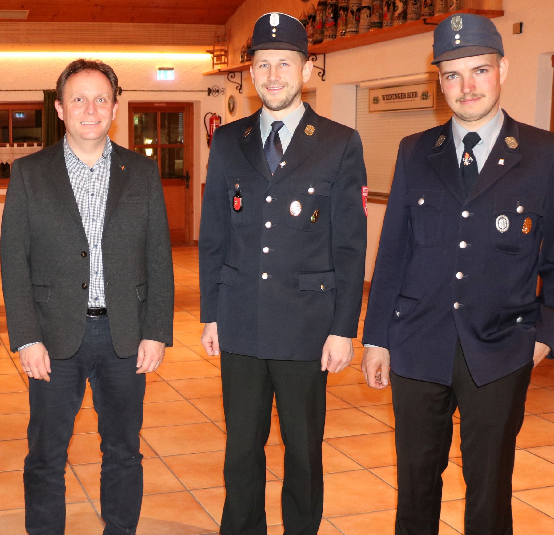 Sepp Weber (Mitte) und Wolfgang Mentzel (rechts) bleiben auch in den kommenden sechs Jahren Kommandanten der Feuerwehr von Frasdorf. Die turnusmäßig anstehenden Wahlen wurden in der Frasdorfer Lamstoahalle unter der Leitung von Bürgermeister Daniel Mair (links) durchgeführt.