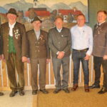 Bericht und Fotos: Heinrich Rehberg – Gauschützenmeister Bernhard Brehmer (links) und Schützenmeister Sepp Staudacher (rechts) ehrten Ehrenschützenmeister Peter Thaurer (60), Friedl Pichl (60) Wolfgang Buchauer (60), Hans Schäffer (50) und Georg Maurer (40) mit dem Abzeichen des DSSB und BSSB für ihre aktive Mitgliedschaft sowie dem Ehrenzeichen des Vereins.