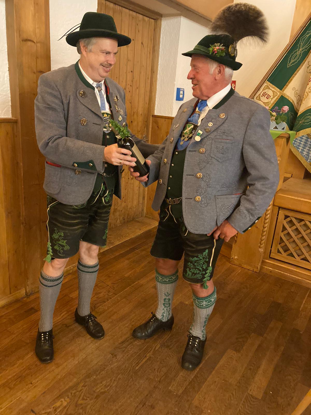Hans Schwaiger (rechts) übergibt Hiataglöckchen an seinen Nachfolger Schorsch Englhart