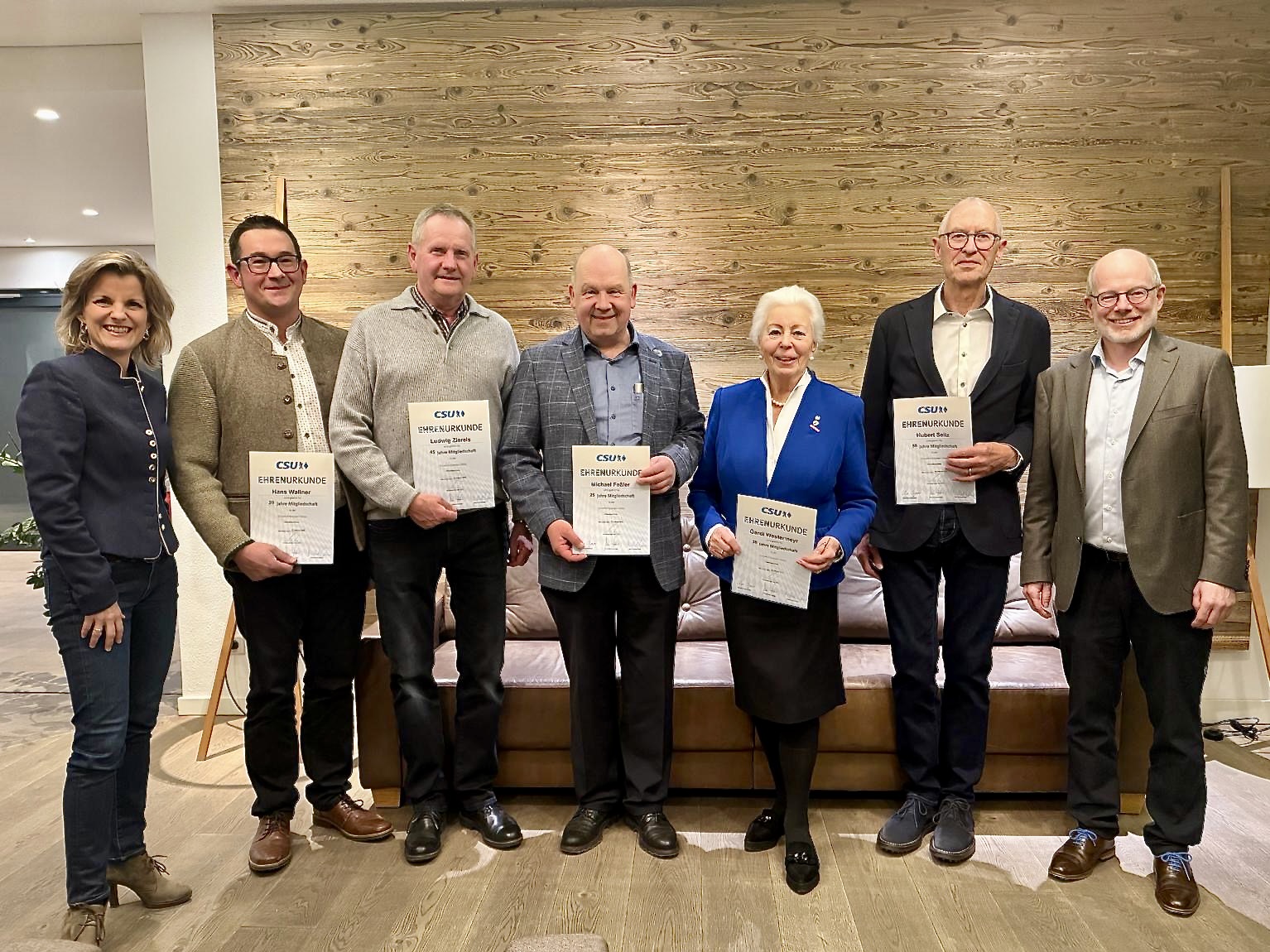 Ehrungen: v.L. MdB Daniela Ludwig, Hans Wallner, Ludwig Ziereis, Michael Feßler, Gerdi Westermeyr, Huber Seitz, Ortsvorsitzender Michael Anner