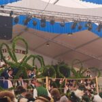 Sehr früh am Sonntagmorgen fuhr der Kleinbus, den der Waldgau bestellt hatte, aus dem Bayerischen Wald los und sammelte unterwegs Mitfahrer in Deggendorf und Landshut ein. Pünktlich um 8:30 Uhr trafen sie ein und sahen bereits Scharen von Trachtlern zu den Zelten strömen. Um die etwa 7000 Trachtler unterzubringen, waren zwei riesige Zelte aufgebaut worden. Um 9 Uhr begann ein kurzer Kirchenzug zu einer Wiese am Ortsrand, wo der Gottesdienst abgehalten wurde. Dankenswerterweise war im Eingangsbereich eine Wasserversorgung eingerichtet, die bei der Hitze im Freien (etwa 30 Grad) dringend nötig war.