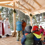 So konnten die Kinder am Nikolaustag wieder an ihren Platz im Wald. Schon länger wurde über den besonderen Tag gesprochen, Lieder und Gedichte eingeübt. Bei leichtem Schneegriesel machten sich die Kleinen auf den Weg, um den Nikolaus mit seinem Engerl zu suchen. Wegweiser waren Spuren von goldenem Engelshaar. Als die Kleinen immer mehr Beweise vom Engerl fanden, haben sie laut in den Wald gerufen „Nikolaus, wo bist Du?“ Wie aus dem Nichts tauchte der Heilige Mann mit seinem roten Mantel, seiner Mitra und dem Stab auf, begleitet von einem weißen Engerl. Die Kinder waren bei seinem plötzlichen Anblick aufgeregt und auch etwas zurückhaltend und respektvoll, bis der Nikolaus voranging zum Mankeibau und die Kinder ihm folgten.