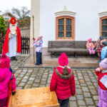 Vor dem Kindergarten begrüßt der Nikolaus die staunenden Kinder, begleitet vom Krampus. Geduldig lauschen die Buben und Mädchen seinen Worten, während eine kleine mutige Sprecherin den Hirtenstab hält. Ein winterlicher Moment voller Tradition, Nähe und leuchtender Kinderaugen.