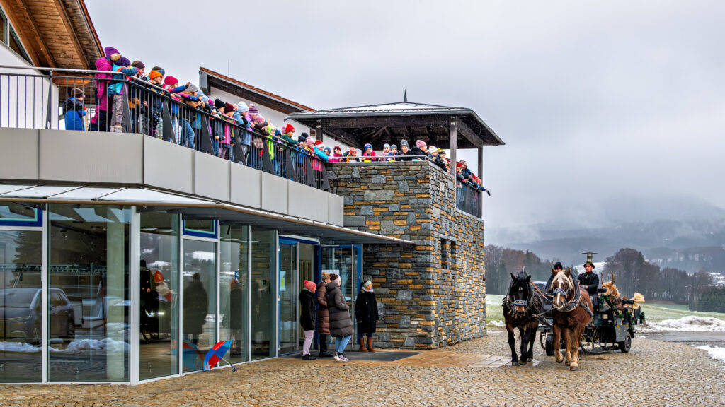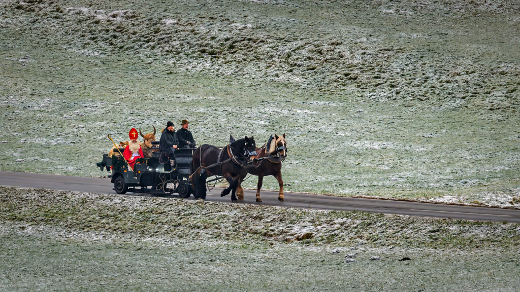 Aus der winterlichen Weite nähert er sich: Der Nikolaus auf seiner festlich geschmückten Pferdekutsche, begleitet vom Krampus und einem Wagen voller Geschenke. Still zieht das Gespann über die schneebestäubten Wiesen dem Samerberg entgegen – auf dem Weg zur Grundschule, wo viele Kinder bereits erwartungsvoll auf diesen besonderen Besuch warten. Ein Moment, der die vorweihnachtliche Magie spürbar macht.