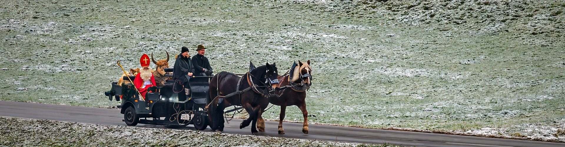 Aus der winterlichen Weite nähert er sich: Der Nikolaus auf seiner festlich geschmückten Pferdekutsche, begleitet vom Krampus und einem Wagen voller Geschenke. Still zieht das Gespann über die schneebestäubten Wiesen dem Samerberg entgegen – auf dem Weg zur Grundschule, wo viele Kinder bereits erwartungsvoll auf diesen besonderen Besuch warten. Ein Moment, der die vorweihnachtliche Magie spürbar macht.