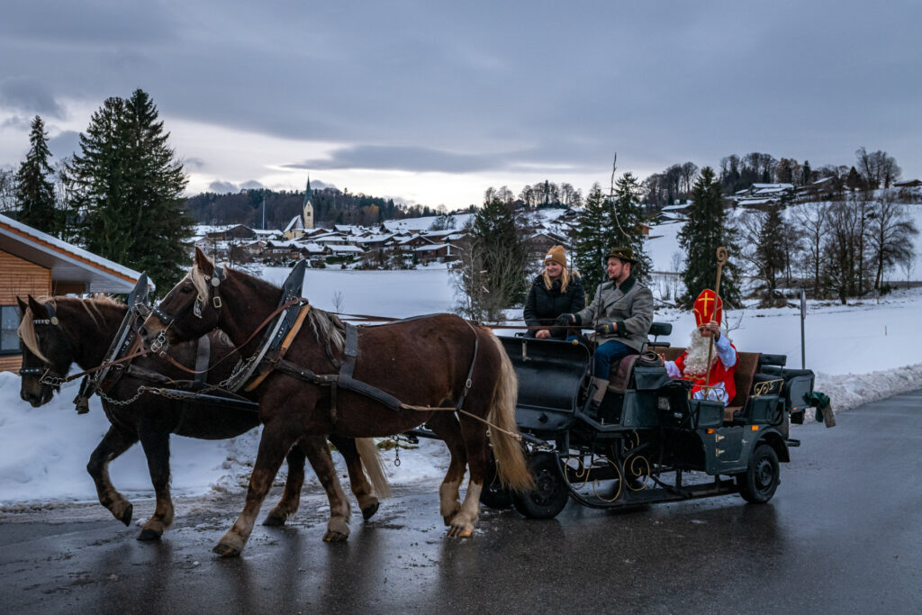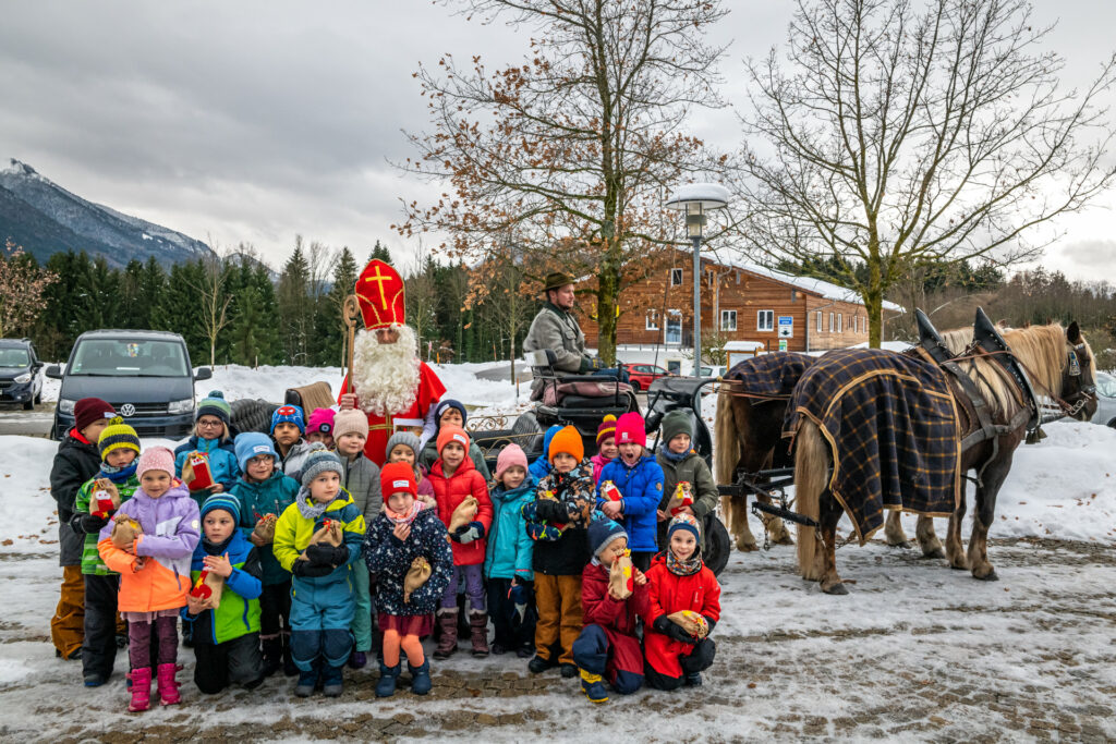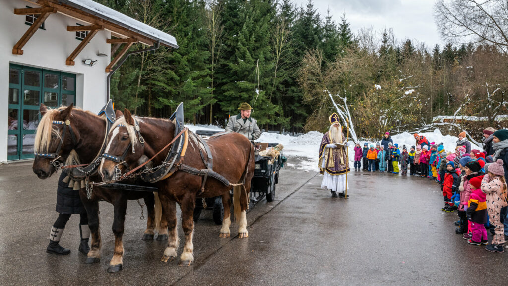 Der winterliche Samerberg erwachte zu einem märchenhaften Spektakel, als der Nikolaus in seiner prachtvollen Kutsche, gezogen von majestätischen Pferden, die Grundschule, den Kindergarten und die Kinderkrippe aufsuchte. Peter und Isabell Weyerer sowie Hans Auer hatten die Pferde vor die festlich geschmückte Kutsche gespannt, während der Nikolaus, in sein beeindruckendes Gewand gehüllt, sich auf seinen besonderen Auftritt vorbereitete.