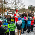Mit einem festlichen “Ho ho ho!” stieg der Nikolaus aus der Kutsche und wurde von den Kindern mit strahlenden Gesichtern begrüßt. In seinem Sack trug er liebevoll vorbereitete Geschenkbeutel für jeden Schüler. Die kleinen Hände der Kinder griffen aufgeregt nach den Beuteln, als der Nikolaus persönlich jedem Kind sein Geschenk überreichte.