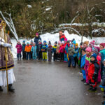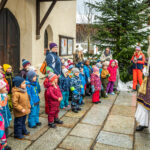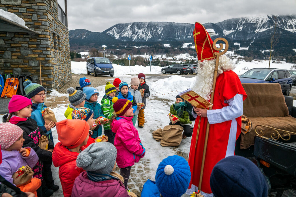 Die Reise führte diesmal zum Dorfplatz und danach zum neuen Kindergarten, wo die Kindergartenkinder gespannt auf den Nikolaus warteten. Auch hier wurde jede Kindergruppe mit einem prall gefüllten Sack Geschenke bedacht. Vor ihren Darbietungen wurden die Kinder mit einer kleinen Geschichte belohnt, in der der Nikolaus die Güte des historischen Bischofs Nikolaus im 4. Jahrhundert hervorhob.