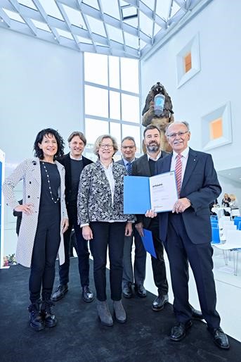 Bei der Auszeichnung im Haus der Bayerischen Geschichte (v.l.n.r.): Christine Degenhart (Präsidentin der bayerischen Architektenkammer), Christoph Schreyer (Leiter des Baureferats beim Bezirk Oberbayern), Dr. Monika Kania-Schütz (Leiterin des Freilichtmuseums Glentleiten), Josef Niedermaier (Landrat von Bad-Tölz-Wolfratshausen), Architekt Florian Nagler und Bezirkstagspräsident Josef Mederer. (Bildrechte: Bayern.by/Gerd Krautbauer)