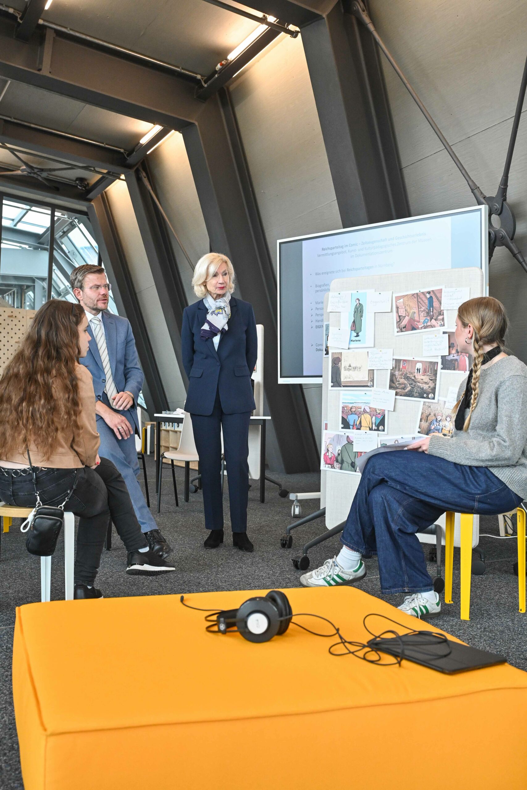 Schüler des Paul-Pfinzing Gymnasiums in Hersbruck, präsentieren am Dienstag, 30. September 2025 Oberbürgermeister Marcus König und Bürgermeisterin Prof. Dr. Julia Lehner, ihre erarbeiteten Resultate, nach dem neuen pädagogischen Konzept des frisch sanierten Studienforums im Dokumentationszentrum Reichsparteitage