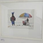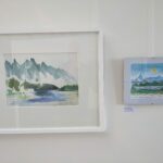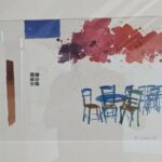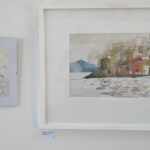 Auf der linken Seite des Raums zeigt Christian Eckler in seinen Aquarellen visualisierte Reiseerlebnisse, unter anderem aus Marokko und Griechenland. Seine Arbeitsweise ist charakterisiert durch großflächige Aussparungen, die dem Betrachter Raum für eigene Interpretation lassen. Immer wieder baut er dabei bewusst durch unorthodoxen Farbauftrag den Zufall ein, der ihm als Sinnbild für die Unplanbarkeit des Lebens erscheint.