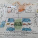 Auf der rechten Seite des Raums präsentiert Ulrike Eckler-Schneider ihre schwung- und fantasievoll mit sicherem Strich aufgetragenen, teilweise durch Pastell farblich akzentuierten Zeichnungen zu Themen wie Jazzmusiker, Arbeiten-Essen-Schlafen, Liebe, Zeitvertreib, Märchen-Puppenspiel, Italien, Irland oder Indonesien. Eine Besonderheit sind ihre sogenannten „Tagesbilder“, ein gezeichnetes Tagebuch, das in 7 x 9 cm-großen Bildern ein Erlebnis des betreffenden Tages darstellt.