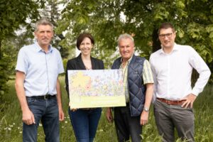 Die Übergabe des Gutscheins erfolgte an Stephanie Lambert, Umsetzungsbegleitung der ILE Holzland-Inntal und die Bürgermeister der Gemeinde Marktl Benedikt Dittmann (ganz rechts), Bürgermeister Karl Brandmüller der Gemeinde Winhöring (ganz links) sowie an Bürgermeister Johann Gaßlbauer, Gemeinde Geratskirchen.