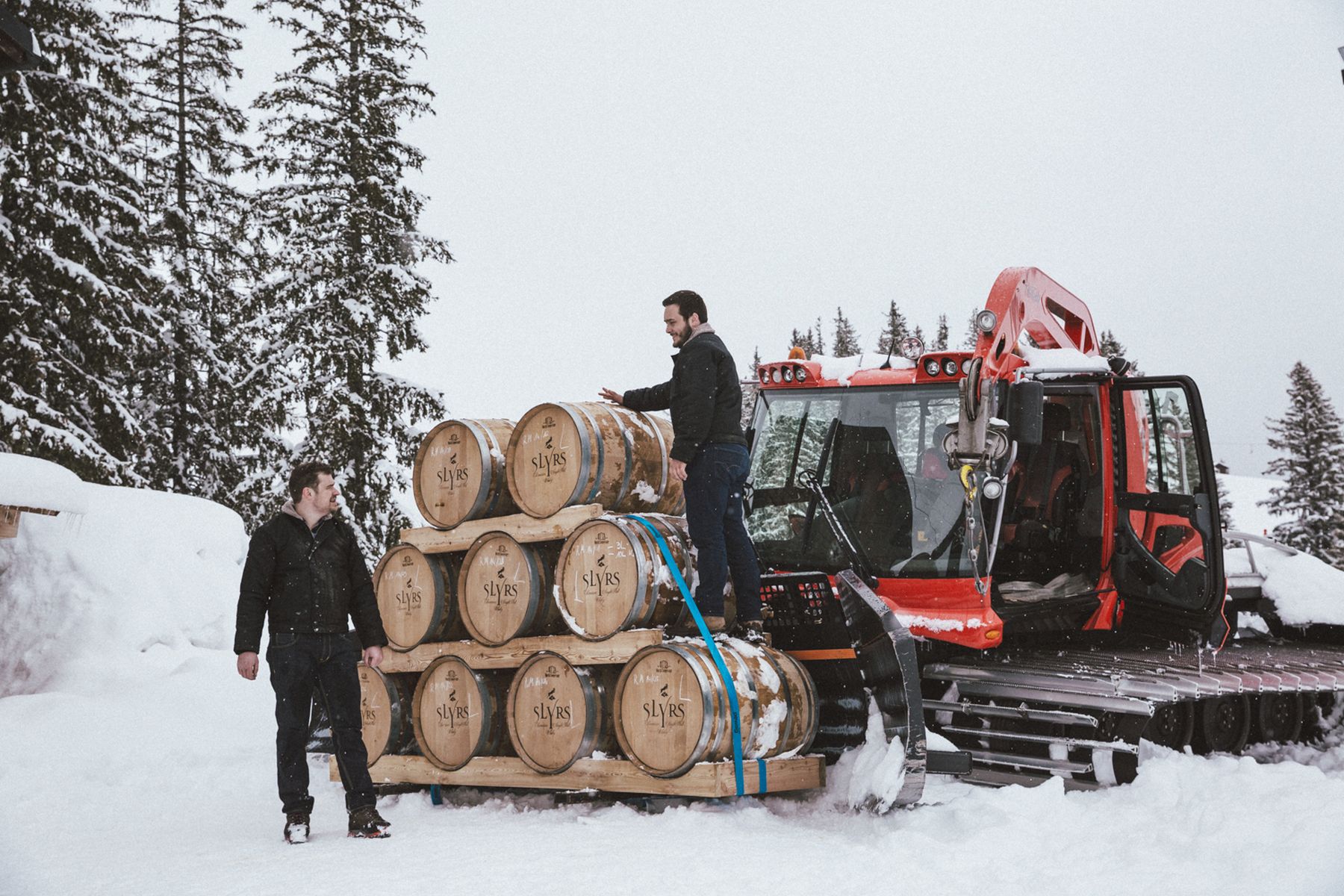 V.l. Philip Zollner (Produktionsleiter, Braumeister) und Kilian Jonscher (Destillateur) beim Beladen der Pistenraupe mit SLYRS Mountain Edition im Skigebiet Spitzingsee-Tegernsee (c) SLYRS Destillerie