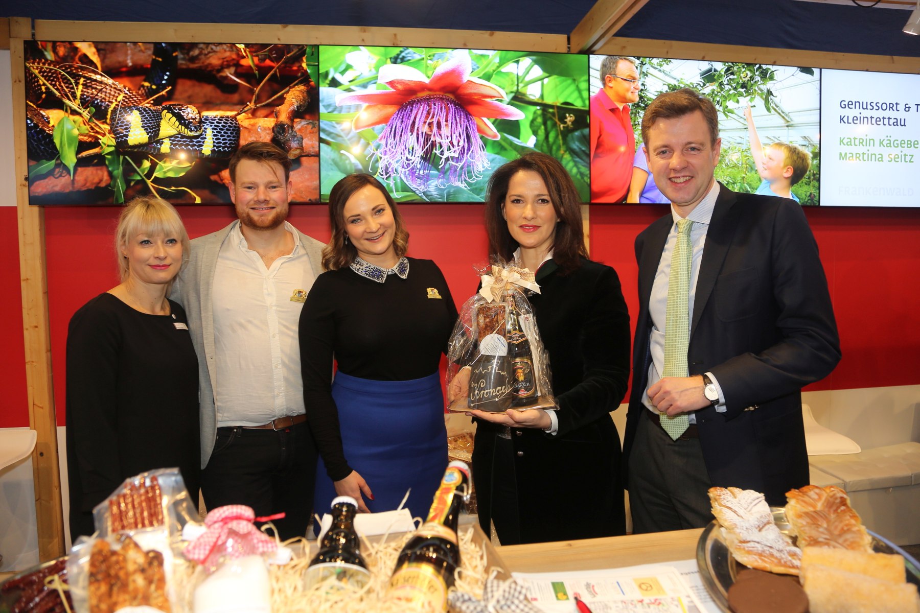 Die Ministerin mit v. l. Franka Leidinger (Frankenwald Tourismus), Philip Kober (Tourismusinformation Kronach), Tina-Christin Rüger (Genussort Kronach) und dem Hofer Landrat Dr. Oliver Bär