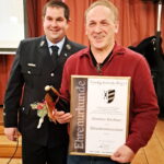 In einer bewegenden Laudation kündigt Simon Frank an: „42 Jahre Vereinszugehörigkeit, die Absolvierung jeder Menge Lehrgänge, von 26. November 1993 bis 26. November 1999 zweiter Kommandant, von 26. November 1999 bis 03. Januar 2006 erster Kommandant, vom 11. Januar 2008 bis 03. Januar 2014 erster Vorstand, seit 2022 Atemschutz- und Gerätewart und hat somit insgesamt 18 Jahre in der Führung, 12 Jahre als Kommandant, 6 Jahre als erster Vorstand die Geschicke der Obinger Feuerwehr geleitet“.