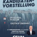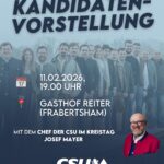 Weiter geht’s am Mittwoch, 11. Februar 2026, ebenfalls um 19.00 Uhr im Gasthof Reiter in Frabertsham. An diesen Abend wird Vorsitzende der CSU Kreistagsfraktion Traunstein, Josef Mayer jun., den Abend begleiten und in einen kurzen Impuls zum Landkreis Traunstein geben. Der CSU-Ortsverband Obing freut sich auf viele Besucher.