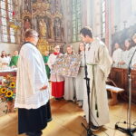 Von den insgesamt ca. 280 Ministranten die mit „ihrem Alois“ an Sonn- und Feiertagen, bei Hochzeiten und Beerdigungen mit im Altarraum standen, haben sich 80 Frauen, Mädchen, Männer und Buben, darunter viele Ehemalige, nochmal eine Albe angezogen um den Festgottesdienst mitzufeiern und wie Pfarrer David Mehlich anfangs des Gottesdienstes erwähnte, habe der Gottesdienst eine besondere Note, weil sich die Pfarrgemeinde vom langjährigen Mesner Alois Hofstetter verabschieden muss. „Er war 36 Jahre Mesner bei uns und habe Generationen geprägt, was man auch an der großen Ministrantenschar sehen kann“, so Pfarrer David Mehlich und hat in einem heiteren Dialog mit Diakon Wolfgang Mösmang den Mesnerdienst mit dem Petrusamt verglichen. So wie Petrus hat der Mesner den Schlüssel der Kirche in der Hand, sperrt die Kirchen morgens auf und abends wieder zu. Ein Mesner ist auch schöpfungsverantwortlich sein, schaut man sich nur die vielen Blumen in der Kirche an, die Zeugen der Auferstehung und nicht Zeugen der Kreuzigung Christi sein.