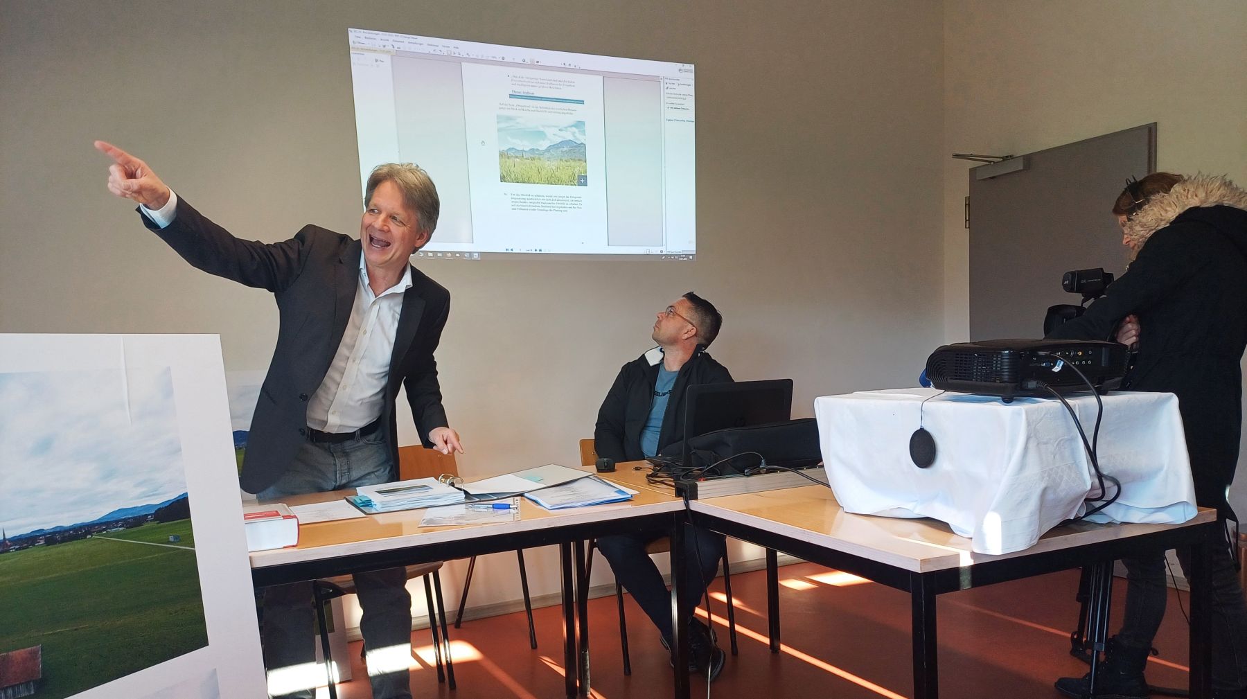 Rechtsanwalt Benno Ziegler und Wolfgang Wimmer, Sprecher der BI, bei der Vorstellung des Gegengutachtens zur geplanten Agri PV Anlage an der Bahnlinie
