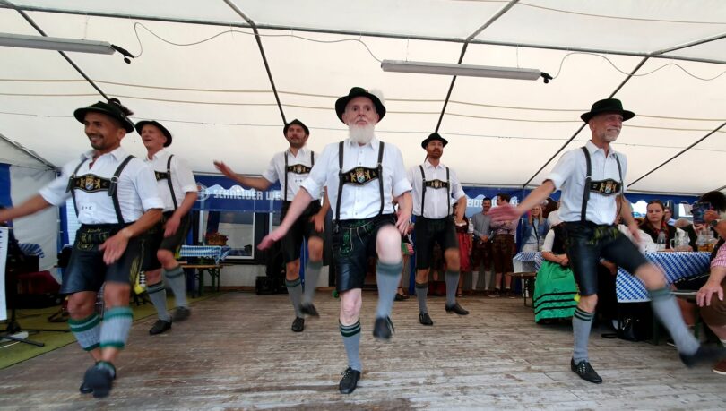 Zur fortgeschrittenen Stunde war dann Wiesn-Gaudi bis spät in die Nacht angesagt. Dabei sorgte der Alpen-DJ des Vereins „Wanja“ für Hochstimmung, unterstützt vom Tonmeister Andreas Amberger. Es war nach der Pandemiepause das erste Oktoberfest des Vereins, das in Eigenregie von den Mitgliedern organisiert und durchgeführt wurde. Dabei hat sich insbesondere unser Neumitglied aus Oberbayern, Anja Gsottschneider, als Küchenchefin voll eingebracht. Mit ihren Erfahrungen in der Event-Gastronomie leistete sie mit ihrem Helferteam Außergewöhnliches. Besonders anerkennenswert war, dass sie trotz nahezu völliger Erschöpfung immer bayerisch „guad drauf“ war. Daneben auch ein besonderer Dank an die ehrenamtliche Küchen-Crew (Andrea, Maja, Margit, Nicole, Ingrid, Kerstin, Karin, Detlef, Bernd, Julian, Andreas, Moritz und viele andere). Es gab selbstgebackenen Kuchen von den Vereinsmitgliedern, deftiges vom Grill, Leberkas-Semmeln und Hopfengetränk gemäß bayerischer Brautradition vom Herzoglich Bayerischen Brauhaus Tegernsee und dem Brauhaus Schneider Weiße.  An beide Brauereien ein herzliches Dankeschön für die Beistellung der Festzelte und deren Dekoration.