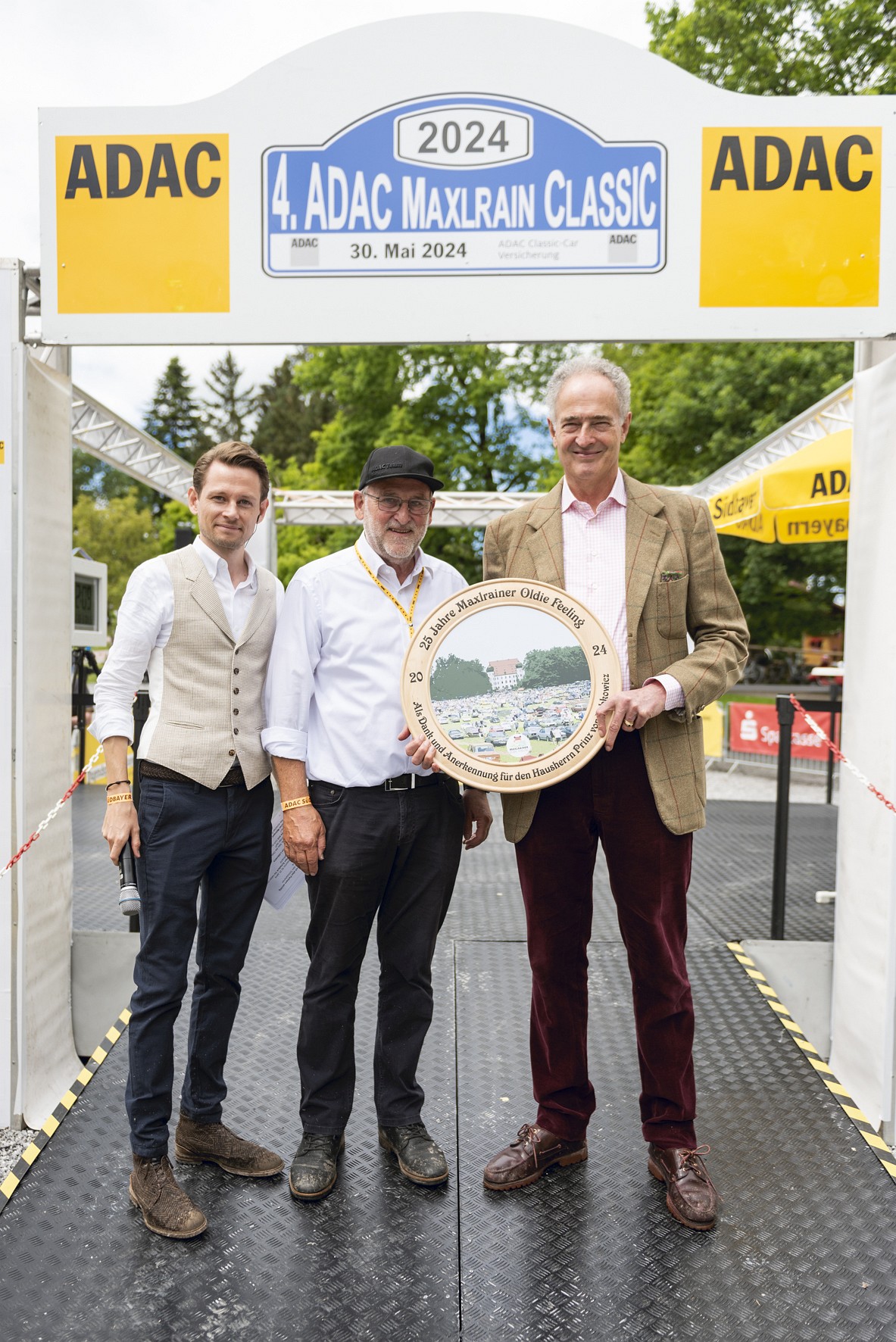 Moderiert von Florian Wolske überreichte Fritz Schadeck (m.) Dr. Erich Prinz von Lobkowicz (r.) eine Ehrentafel und dankte ihm für die Gastfreundschaft bei den bisherigen 25 Ausgaben des Maxlrainer Oldie Feelings. Foto: ADAC Südbayern / Schwarz Fotografie